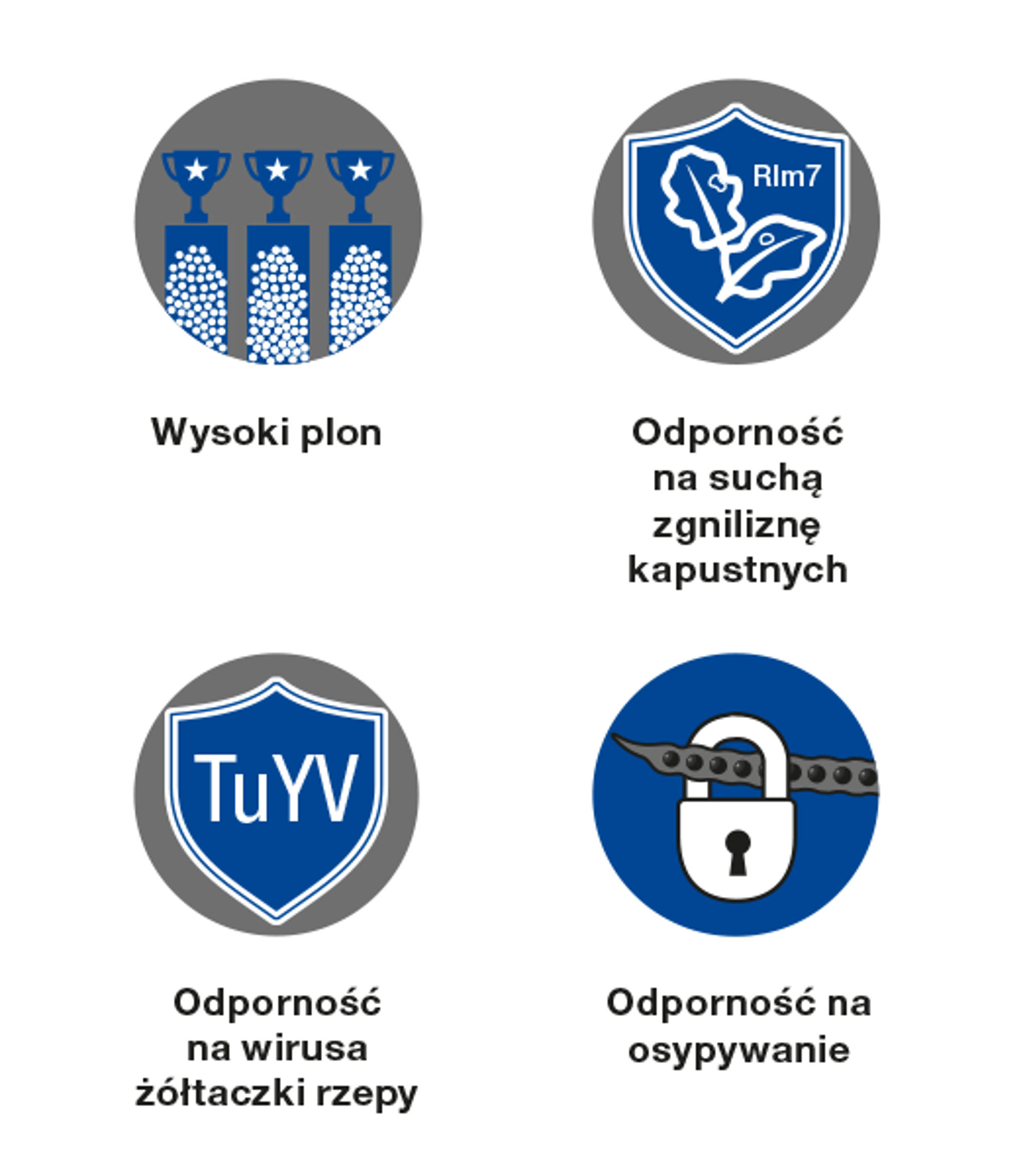 - Odporność na wirusa żółtaczki rzepy (TuYV) oraz suchą zgniliznę kapustnych (gen Rlm7)